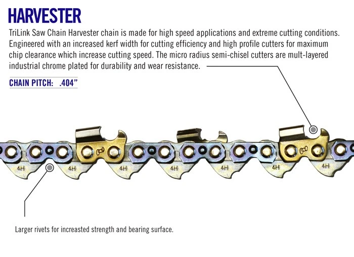 TRILINK Harvesterin 404″ teräketju. Trilink-ketjut on valmistettu parhaasta seostetusta teräsmateriaalista ja pinnassa on useita kromipäällysteitä parantamaan kestävyyttä. Tällä harvesteriketjulla on erityinen korkean profiilin sahauskulma, joka takaa parhaan leikkaustuloksen ja hyvän leikkaushakkeen poiston. Suurimpien niittien ja leveiden kosketuspintojen ansiosta Trilink-ketju on paras valinta.